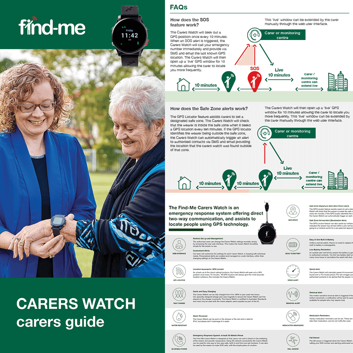 The Find-me Carers Tunstall Watch — a 24/7 monitored personal emergency response device combining GPS tracking, fall detection, and two-way communication to help users live safely and independently.