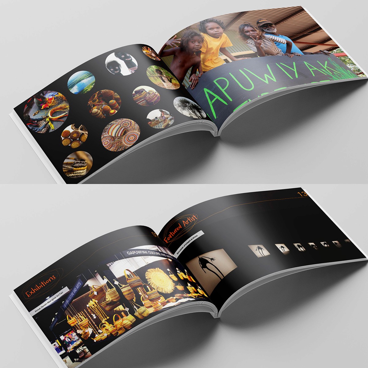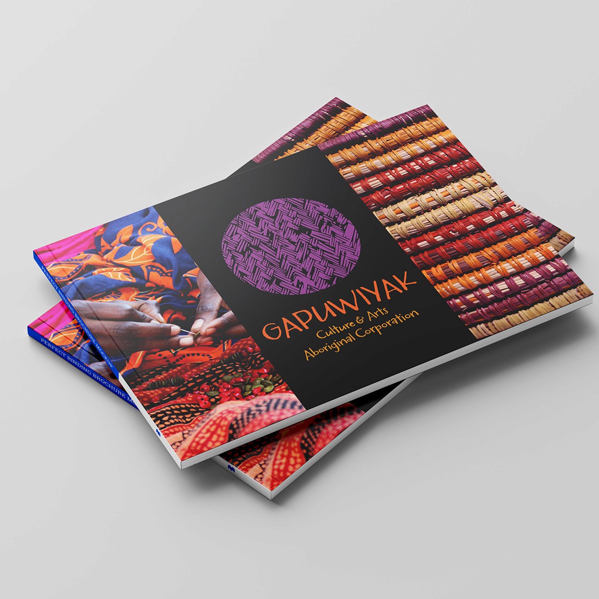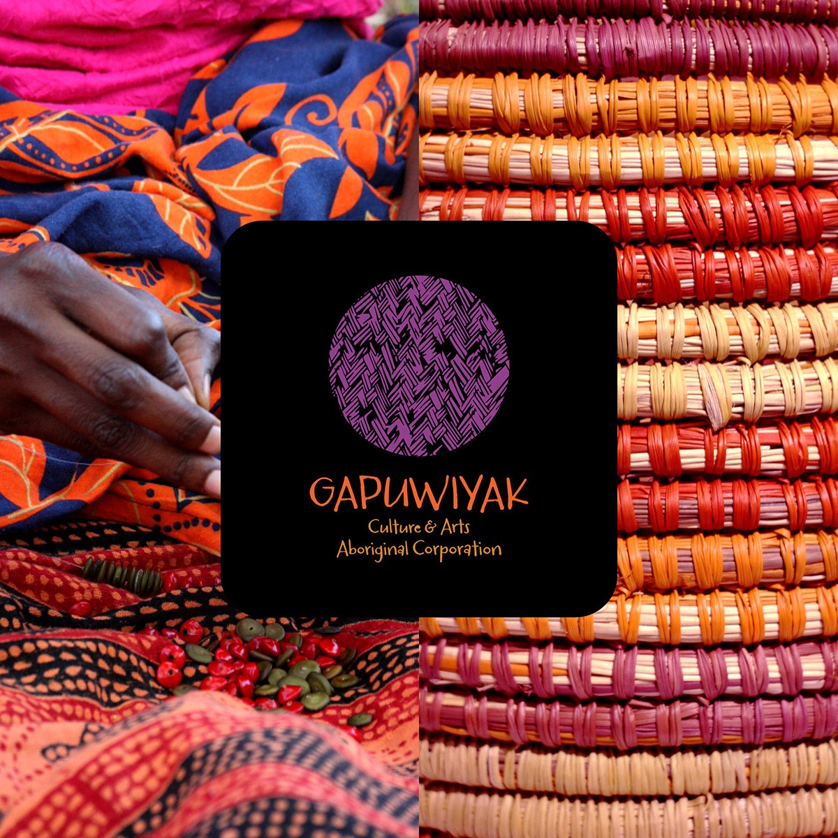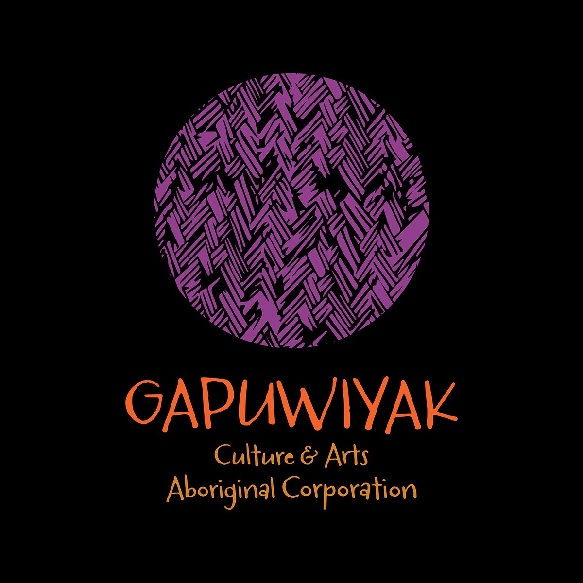 The branding for Gapuwiyak Culture & Arts is vibrant and contemporary, while deeply grounded in the aesthetics and spirit of traditional Yolŋu craft. The bold circular motif, with its hand-drawn texture, reflects the intricacy and rhythm of weaving and mark-making practices passed through generations. A striking palette of earthy orange and vivid purple balances warmth and vitality with cultural richness, ensuring the identity feels both modern and authentic.
