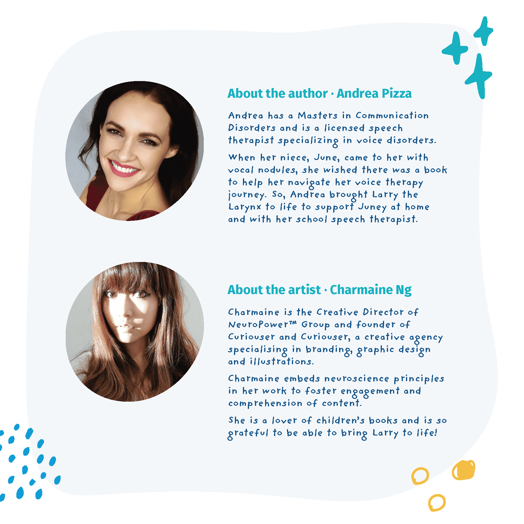 Created by speech-language pathologist and voice therapist Andrea Pizza, Captain June & Larry the Larynx is a children’s book and voice‐therapy tool designed to support kids with vocal nodules and other voice disorders.