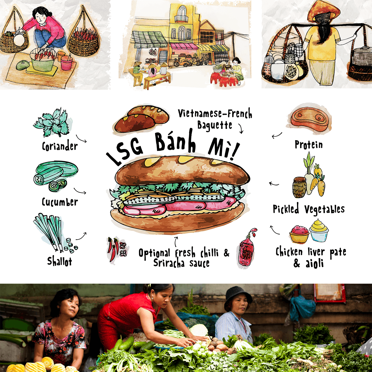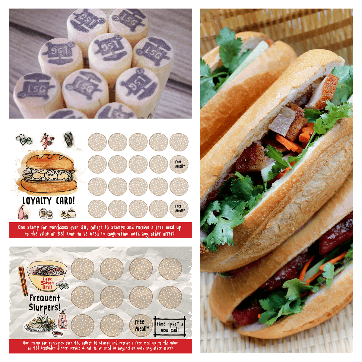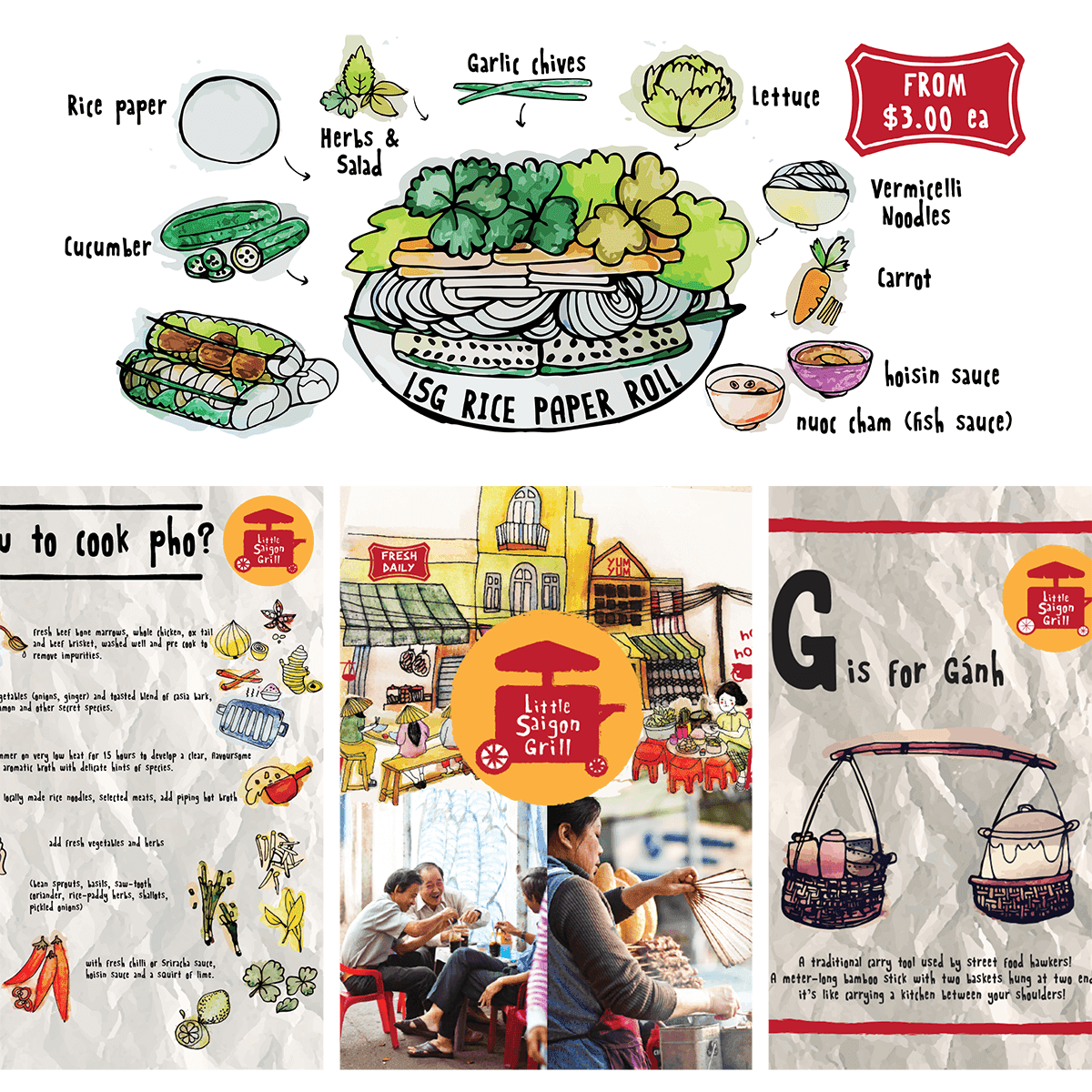 Little Saigon Grill's brand identity captures the authentic energy and street food culture of Vietnam through a rustic, handmade aesthetic. The charming illustrated logo features a traditional hawker cart surrounded by bustling street scenes, immediately transporting customers to the vibrant markets of Saigon. The cohesive brand system extends across all touchpoints - from the distinctive loyalty stamp cards featuring traditional Vietnamese motifs to promotional materials that showcase the lively street food culture.