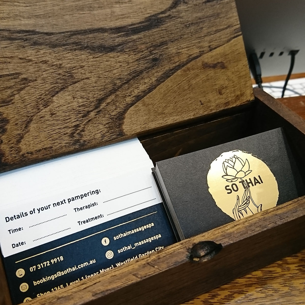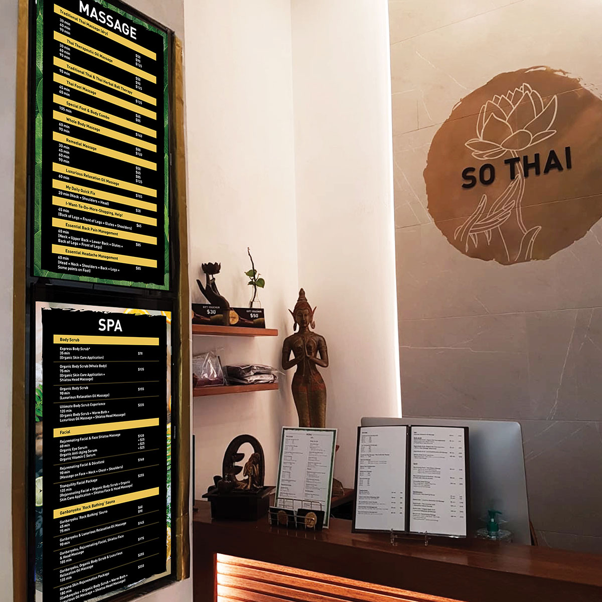 Inspired by hand movements in traditional Thai dance forms, the logo encapsulates the essential element of So Thai – customer care and massaging by hand. It also makes reference to Theravada Buddhism, reflecting on the rich culture and history of Thailand. The logo depicts a hand gently handling a lotus flower, alluding to the pampering and delicate handling of our customers.