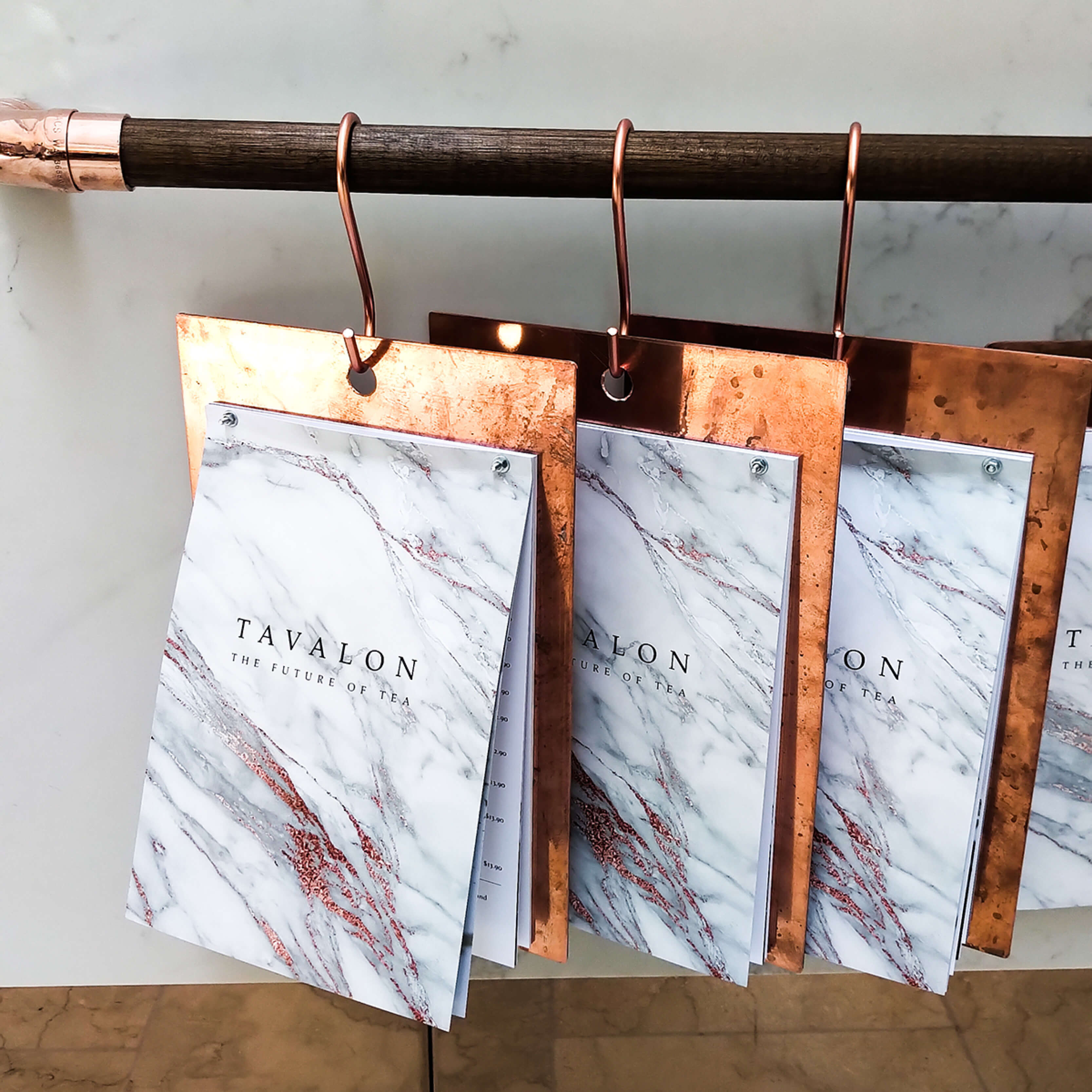 A standout element of this project was the creation of bespoke copper-sheet menus for Tavalon Tea's Brisbane outpost. Each menu was hand-sanded and ensembled, allowing natural patina and raw metal textures to shine through.